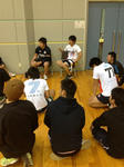 奥田監督(3年生/伏見工業)、松本コーチ(3年/神戸甲北)を中心に正座で集まるラグビーゼミのみんな