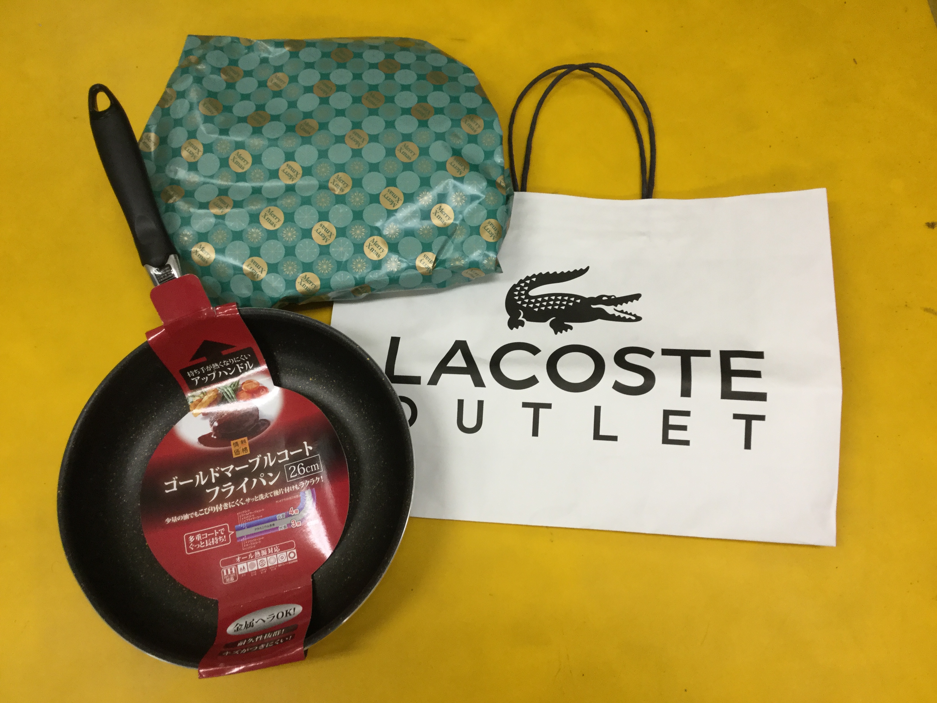 ラコステの紙袋に入った、クリスマス用の包装紙に包まれた、フライパンでした。